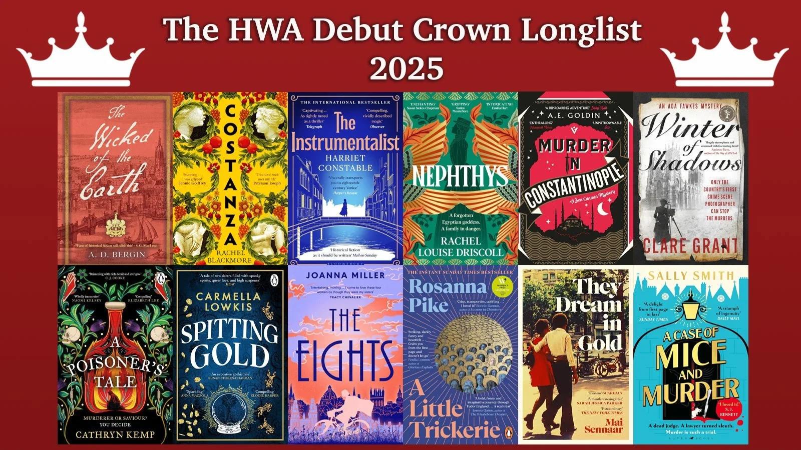 The HWA celebrates the best in historical writing, fiction and non-fiction, published during 2024–2025. There are three awards categories: HWA Gold Crown, HWA Non-fiction Crown, and HWA Debut Crown, and 12 books in each category.