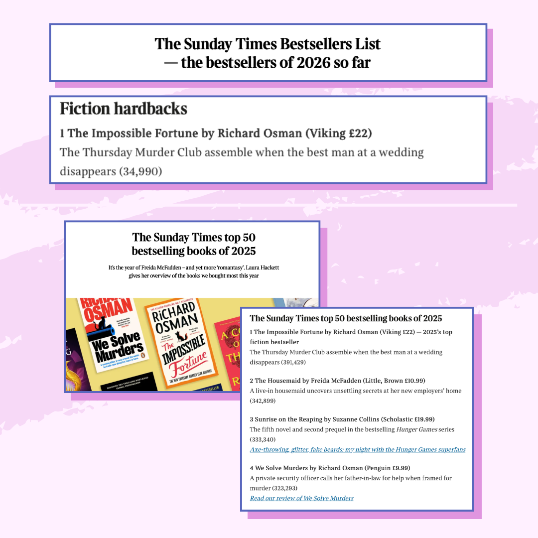 Following on from a stellar 2025 where Richard Osmans The Impossible Fortune was crowned The Sunday Times top selling fiction of the year (with We Solve Murders coming in at number 4), the novel has now been named as the bestselling hardback of 2026 (so far). More than six months after it originally published!